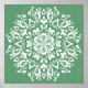 Denna vita mandala sitter på grått-gröntens bakgrund. Färg är naturligt och avslappnande. Del av Pras Mandala-samlingen.