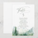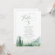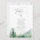 Vattenfärg frodig grön tallskog och dimmig berg med sage modern skrift, elegant och romantisk, fantastiska personliga bord sittplatskort för boho rustik bröllop och berg skog destination bröllop på våren och sommaren.