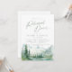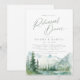 Watercolor lush green pine forest, teal river, and misty mountain with sage modern script, elegant and romantic, great rehearsal dinner invitation for boho rustic wedding and mountain forest destination wedding in spring and summer.