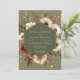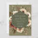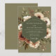 This design showcases a romantic botanical arrangement with creamy white anemones and rich terracotta peonies. Sprigs of delicate greenery and small berries are artfully placed against a deep sage green background. The painterly style creates a sophisticated, earthy, and moody atmosphere for an elegant union.