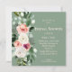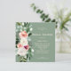 En chic och en modern inbjudan med vit ros & eukalyptus med inslag, rosa och persikofärgad blommigt mot bakgrund av en grönt för rik. Dina detaljer visas i ett fixerat och sofistikerat serif-teckensnitt.