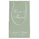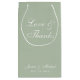En enkel påsfavorit för bröllop med en mycket modern färg: salvia grön. Den har bara vit text på salvia grön bakgrund. Meddelandet "Love & Thanks" och namnen på bruden och brudgummen är skrivna med elegant kalligrafi.
