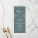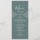 Elegant, modern, boho, vintage salviagrön bröllopsmeny med silverrep hjärta och förgylld blomster spets.