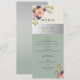 Enkel, rustik, botanisk, elegant sagegrön bröllopsmeny med akvarell rosablommor och modern kalligrafi.