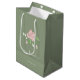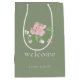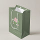 Chic och elegant. Denna stilrena bröllops 'välkommen' förmånspåse har en vacker rosablommig illustration, tillsammans med moderna teckensnitt och en sagegrön bakgrund. Med på baksidan finns parets initialer, datum och plats. Variationer av denna design finns att se i hela kollektionen.