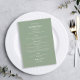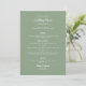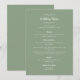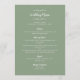 Denna salviagröna meny för bröllopsmiddag har elegant vit kalligrafi med klassiska dekorativa detaljer som inramar titeln ”Bröllopsmeny”. Den formella layouten framhäver varje rätt med ren, minimalistisk typografi för en förfinad och tidlös presentation. Den kantlösa designen låter dig välja din föredragna pappersform, och den enfärgade salviagröna baksidan kompletterar den koordinerade looken. Anpassa med dina evenemangsuppgifter, och tveka inte att höra av dig för anpassat avstånd eller färgförfrågningar.