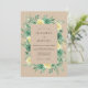 Denna design har en varm, tanfärgad bakgrund med ett rikt vattenfärgblommotiv. Ömtåliga, blekgula rosor och djupgröna blommor är placerade bland en variation av salvia grönska och eukalyptusblad. Den jordnära färgpaletten frammanar en lugn, naturlig atmosfär perfekt för en säsongsbunden utomhusceremoni. Handmålade botaniska detaljer skapar en sofistikerad men organisk känsla.