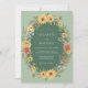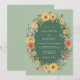 Denna botaniska design har en frodig arrangemang av livliga akvarellblommor mot en mjuk sagegrön bakgrund. Gyllene gula solrosor och terrakotta dahlior är sammanflätade med silver eukalyptusblad och ömtåliga ormbunksblad. De rika skoggröna nyanserna skapar en slående kontrast, perfekt för ett jordnära höstligt eller skogsbröllopstema.