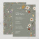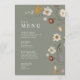 Bröllopsmenykort kännetecknas av boho-stil, blomsterkonst, sagegrön och beige färg, med en blandning av olika typsnitt, ofta i olika storlekar, för att skapa en unik, eklektisk look som gör denna meny naturlig estetik.