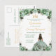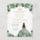 Denna eleganta och glamourösa Quinceañera-födelsedagsinbjudan visar en vacker prinsessa med mörkt hår i en sagegrön baddräkt. Texten kombinerar handskriven skrift och moderna sans serif-teckensnitt för en klassisk och sofistikerad look. De blomsterarrangemang och guldconfetti skapar den perfekta blandningen av rustik och chic.