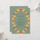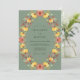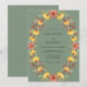 Denna design har en frodig krans av höstinspirerade blommor mot en lugn sagegrön bakgrund. Levande gula kosmosblommor och terrakottaorange blommor är sammanflätade med ömtåliga röda bär och eleganta gyllene vinrankor. Den jordnära färgpaletten skapar en varm och inbjudande atmosfär perfekt för en rustik skördefest eller hösthögtid. Rika texturer och botaniska detaljer ger en sofistikerad men naturlig estetik.
