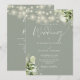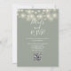 Denna eleganta, sagegröna bröllopsinbjudan med vackra strängljus och blomstergrönska kan anpassas med din information i chic typografi med din bröllopswebbplatsinformation och din QR-kod på baksidan. Designad av Thisisnotme©