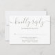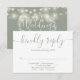 Ett stilfullt RSVP-kort med dina detaljer skrivna i chic typografi och personifierat med era namn, handritad blomsterlövverk och strängljus på en sagegrön bakgrund på baksidan. Designad av Thisisnotme©