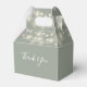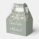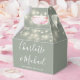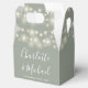 Elegant bröllopspresentförpackning med vackra strängljus, chic signatur skriptnamn och speciellt datum på en sagegrön bakgrund. Du kan anpassa med ditt eget tackmeddelande på baksidan. Ett perfekt sätt att tacka dina gäster! Designad av Thisisnotme