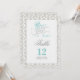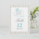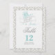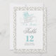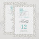 Sagoberättande bordskort i akvamarin, grå, vit och svart färgskala på en damastbakgrund.