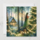 Whimsical AI-illustration av en fe eller ängel som dekorerar ett julgran med vita lampor mot en mysig lantlig stuga i bakgrunden.
