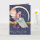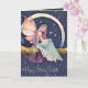 Akvarell födelsedagskort med en älva som svävar i natthimlen med fjärilsvingar. Ljuslila hår och guldbeslag. Insidan har ett trevligt meddelande för flickans födelsedag, men detta kort kan användas för alla firanden. Båda sidor av kortets insida är natthimlen med moln och glittereffekt.