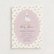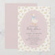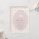 Diskret och tidlös baby shower-inbjudan med en charmig illustration av en gås i sagobokstil, accentuerad med en mjuk blå rosett, omgiven av ett romantiskt blomsterträdgårdsmönster. Den rosafärgade ramens scallopade kanter och den milda pastellfärgspaletten skapar ett varmt, arvsberättigat utseende som känns sött, nostalgiskt och vackert elegant.