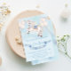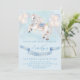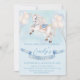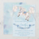 Häst-tema födelseinvitation med illustration av en söt baby vit magisk häst och Vattenfärg saga guldstjärnor med pastellfärgade ballonger och blå band för firande!
