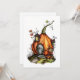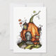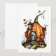 Bilden föreställer ett fantasifullt, sagostilslat hus format som en stor, livfull orange pumpa. Pumpan har förvandlats till en mysig bostad med en trädörr framtill, två små fönster på sidorna och två pittoreska, tornliknande strukturer på toppen med röda tak. Huset är omgivet av slingrande vinrankor och höstlöv, vilket bidrar till den magiska och förtrollade atmosfären. Miljön antyder en lugn, skogbeklädd miljö, perfekt för en saga om en fe eller magisk varelse.