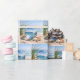A serene coastal scene showcases a sailboat beautifully reflected in a glass sphere, surrounded by seashells and green grass on a sandy beach
