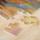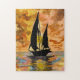 en dekorativ vattenfärgsgrafik av en segelbåt som driver på havet under en färglös solnedgång himlar med färgfulla reflektioner i vatten som ett pussel.