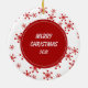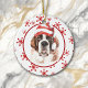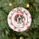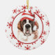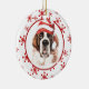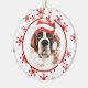 På framsidan av den här Helgdag är en vacker vattenfärgbild av en Saint Bernard med en röd och vit strimlad julhatt. Bilden placeras på en vit cirkel som ramas in av en retroröd snöflinga mönster. Baksidan av dekorationen har samma bakgrund och cirkel med anpassningsbarnas text vit på en motsvarande röd bakgrund. Cute, särskilt för någon som kärlek en Saint.