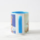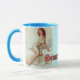 Saint & Sinner ringer mugg har två vintagars pinup flicka bilder och koordinerar akvasblått. Texten är röd och vit.