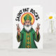 This card shows Saint Patrick centered on a bright white background, standing in emerald green robes with a matching mitre decorated in golden Celtic-style patterns. A warm yellow-and-orange halo radiates behind his head, framing his wide grin and flowing white beard in a way that feels friendly and a little flirty, like he’s posing for someone he adores. Both hands are lifted near shoulder height, and his fingers form peace signs that read as an easygoing “we’re in this together” gesture 💚. Above him, the phrase “SAINT PAT ROCKS” arches across the top in large, dark lettering that stands out sharply against the white space. The robe details use rich gold accents and repeating motifs that add texture and a dressed-up look without crowding the scene. The strong outlines and simple shapes keep the figure crisp and graphic, while the warm halo colors add a cozy glow around his face ☘️. The final look is a single central character with green-and-gold clothing, a sunburst halo, raised peace-sign hands, and arched headline text at the top.