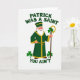 This greeting card shows a stylized Saint Patrick figure standing in the center on a bright white background, dressed in an emerald green robe with gold trim and a matching cap. He has a full white beard and a rosy nose, giving him a friendly, slightly teasing look that feels like an inside joke shared between close friends 💚. In one hand, he holds a slender shepherd’s crook with a gold curl that stands out against the green. Three green shamrocks float around him, spaced to the left and right like small accents that keep the scene light and balanced ☘️. Above the figure, green lettering curves in an arc reading “PATRICK WAS A SAINT.” Below him, more green text sits in a straight line reading “YOU AIN’T,” landing like a cheeky punchline. The greens and golds stay rich against the white space, with the shamrocks and crook curl echoing the same tones across the design. The robe’s folds, the gold edging, and the three shamrocks are the main details against the open white field.