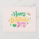 Vackra, St patrick's day-temerade bokstäver omgivna av en glans, gnistor och regnbåge. Det innehåller citatet "Lycklig St patrick's day". Njut!