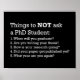 Lustigt poster med en lista på fem sak för att inte fråga PhD student. 1 När kommer du student? 2 Skriver du din tes? 3 Hur går forskningen? 4 Har din papper publicerats än? 5 Vilket år är du igen?