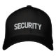 Svart hatt med vita bokstäver som identifierar medlemmar i säkerhetsteam för musik, film, säkerhet eller andra evenemang.