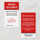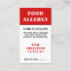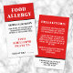 Varningskort för Red & Black Contemporary Lodrät Food Allergy Alert Card. Designat med ett fet och klassiskt utseende kombinerar det här lodrät matallergiskt kort starkt serif typsnitt med ett rent sans serif-teckensnitt för ett polerat utseende av professionellen. Framsidan har en slående svart bakgrund med skarp vit text och en klar och lättläst layout. Överst visas "LIVSMEDELSALLERGY" på en framträdande plats för att synas omedelbart. Under finns det utrymme för att lägga till ditt namn och en lista över livsmedelsallergier så att personalen snabbt kan identifiera vad du ska undvika. Ett bestämt område vid grund gör det möjligt för restaurangen att notera bordsnumret och på så sätt säkerställa omsorgsfull service. Baksidan innehåller ett koncist och respektfullt budskap till kökspersonalen om hur allvarliga dina allergier är, tillsammans med plats för en kontakt med akutet. Fullständigt anpassade, detta kort behållor sak säkert samtidigt som en förfinad, professionell och synlig presentation bibehålls.