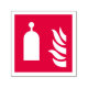 Flaska med ett handtag på överkanten och flamsymbolen på röd bakgrund.