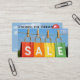 Four colorful shopping bags spelling 'SALE' dangle from a clothesline, beautifully contrasting with the natural scenery behind them.