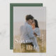 Ett modernt foto bröllop sparar datum-kort med en elegant sagegrön layout i kombination med en minimalistisk fotoutformning. Perfekt för par som söker en förfinad, samtida estetik med en mjuk, romantisk känsla.