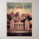 En vintage-inspirerad reseaffisch illustrerar Salt Sjö City, Utah, som återges i en stil som påminner om 1920-talets Art Deco. Det centrala fokus ligger på den ikoniska Temple-kvadraten, som visas med ornerade detaljer och en storslagen, symmetrisk layout, med bathet i ett varmt, diffust ljus. Omkring Tempeltorget är stiliserade föreställningar av Wasatch-bergen, som subtilt bleknar i ett sepiatonat himmel med milda, snurrande moln. "VISIT SALT SJÖ CITY" i ord visas högst upp med ett fet, geometriskt typsnitt, vilket tyder på en känsla av äventyr och nostalgi.