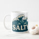 Gigantiska vågor med vita toppar rullar mot stranden i denna retroinspirerade kustgrafisk design. Krämig vintage SALTY-text skapar en djärv kontrast mot den tealblå oceanen. Tillverkad för strandälskare, surfare, soldyrkare och alla som lever på ötid. Denna mugg är ett bra sätt att tillföra havsrelaterade vibbar till din kaffetid.