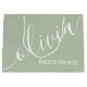 Överraska dina brudtjejer med denna vackert moderna stora presentpåse i salvia grön, med elegant minimalistisk skrift och en mjuk, jordnära färgpalett. Designad med en modern estetik är denna rymliga påse perfekt för morgonrockar, ljus, accessoarer eller souvenirer. Den raffinerade skriften och den subtila salvia tonen gör den till ett stilrent val för förfrågningar till brudtjejer, bröllopspresenter eller möhippor. Personalisera med namn eller anpassad text för att göra den ännu mer speciell. Denna presentpåse erbjuder den perfekta balansen mellan naturlig elegans och modern enkelhet - ett genomtänkt och stilrent sätt att säga tack.