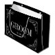 Anpassningsbar sammade brudens sida bröllop-presentpåse för brud. Lägg till din egen party favors och dina egna produkter. Små, medelstora och stora storlekar. Anpassade stringade påsar med datum giftermål. Lägg till din egen namn som tillval. Svartvit eller anpassade färg. Elegant-typografi-mall med snabb hörngrafik i gräns. Skapa vackra påsar till ny gifta-par, gäster, brudar, brudgummar, brudar, marskalkar, familj osv. Skapa hans och hennes.