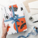 Coola Halloween-temat sömlöst mönster. Samling av Halloween-symboler (spindel, pumpor, till några få namn) i svart orange och gult färg mot vit bakgrund.