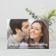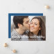 Om omständigheter som social distansering kräver att du minskar och reducerar antalet gäster på ditt bröllop kan du låta din utökade familj och vänner på din ursprungliga gästlista veta att ert bröllop kommer att genomföras men nu i mindre skala med detta nedskalade bröllopsutskick. Framsidan visar ert favoritfotografi från förlovningen och "Samma stora kärlek, nytt mindre bröllop" skrivet med stor modern vit skrivstil längst ner på ert fotografi, och under detta kan ni anpassa era namn och bröllopsmeddelandet om nedskalning. På baksidan kan ni anpassa ert meddelande mer i detalj och lägga till information om eventuell livestreaming, kommande firande och bröllopswebbplats, allt i vit typografi mot en klassisk blå bakgrund.