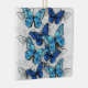 Lodräts sammansättning av realistiska, blå och vita morfobutterflies på gråttets texturerade bakgrund. Morpho Blue Butterfly.
