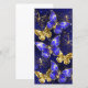 Sammansättning av lyxsafir och smyckesfjärilar från guld på blå texturerad bakgrund.