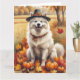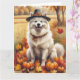 En akvarellmålning av en glad hund som sitter mitt i en hög med livfulla höstlöv, omgiven av små pumpor och utspridda ekollon. Hunden bär en liten pilgrimhatt och strålar av glädje och fångar Thanksgivingandan. I bakgrunden skapar mjuka skördefält och gyllene träd en fredlig lantlig stämning. Sköna texturer och varma, dämpade hösttoner ger scenen en mysig, nostalgisk känsla som är perfekt för att fira årstidens skönhet.