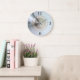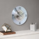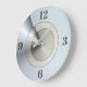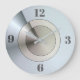 En samtida klocka i blekblått och grått, med en cirkeldesign i mitten av vit- och silverfärg. Speciella ljuseffekter bidrar till atmosfären. Finns i fyrkantiga och runda former.