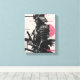 Ett digitalt verk med en samurakrigare i fullt pansar, som står i profil mot en vit bakgrund med stänk av rosa färg. Samurai är skilt i en stum och håller två svärd vid sin sida. Bilden har ett fet och grafiskt stil, med vasst linjer och kontrasterande färg. De rosa färgstänkarna tillför en gnutta dynamik och energi till sammansättningen.