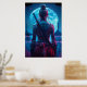 A powerful illustration of a female samurai warrior, traditional tattoos, standing under the full moon with cherry blossoms around. Strong composition inspired by Japanese culture.