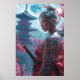 A powerful illustration of a female samurai warrior, traditional tattoos, standing under the full moon with cherry blossoms around. Strong composition inspired by Japanese culture.